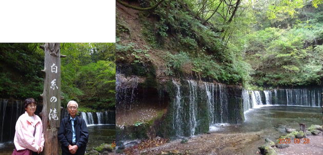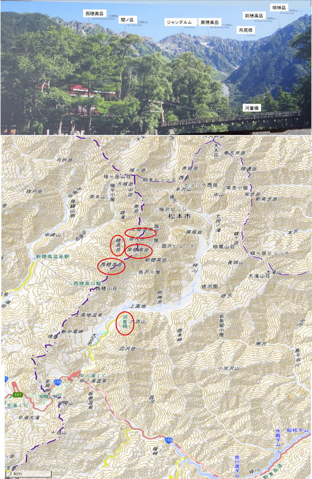 写真2.上段:河童橋から見た穂高連峰(河童橋案内板写真に筆者名称追記)(2025年9月29日撮影)