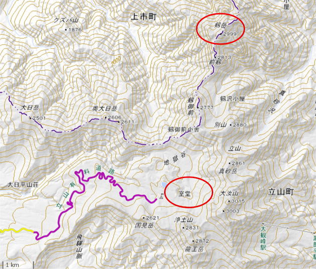 写真3.立山・黒部峡谷(出典:国土地理院標準地図、赤丸筆者追記(上方の○囲みが剣岳、下方の囲みが室堂))